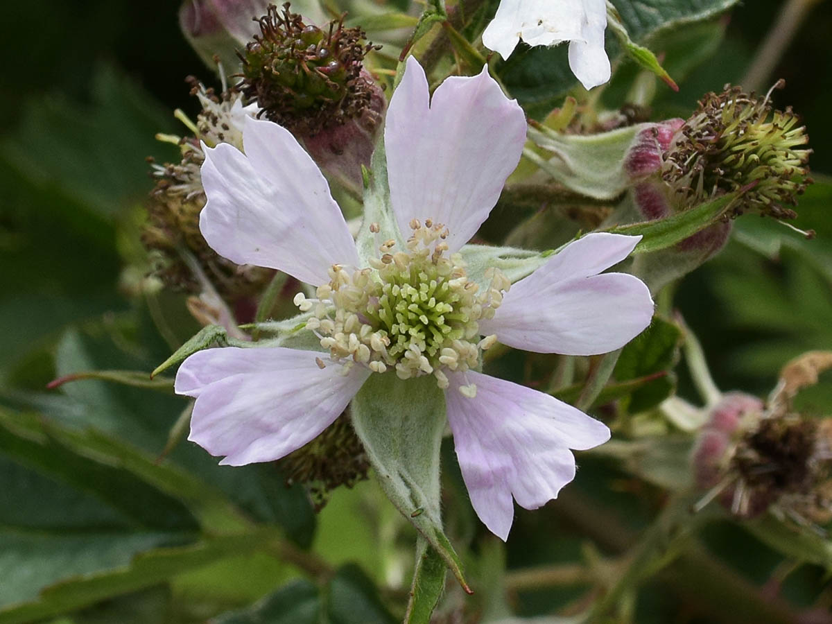 The Cut-leaved Bramble is the only species with strongly lobed and dissected leaflets, making it instantly recognisable. It is believed to be genetically related to R. nemoralis. The three-lobed pale pink petals are also unique. Although usually described as being of horticultural origin (and still sold in garden centres), this is not strictly correct as it is likely that it was originally discovered growing naturally in the wild as a genetic oddity and subsequently taken into cultivation for its attractive appearance. According to the famous batologist WCR Watson it was first mentioned in British garden literature in 1754, but it was not named until 1809. It currently occurs naturalised in the wild throughout the UK (and can be somewhat invasive), but is more scattered in the moister climate of the south-west, Wales and the highlands of Scotland. It is still increasing, especially in areas of lightly wooded heathland in southern England, but it is probably also becoming more common in rough ground and brownfield land in and around towns and cities.