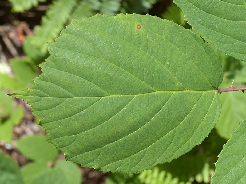 Leaflets are almost glabrous above and below, a mid green or yellowish-green colour. The terminal leaflet is about 10 x 7cm, but sometimes larger. It is usually convex, broadly ovate or elliptical, often with straight sides mid-leaf, producing a somewhat oblong shape. The toothing is finely serrate or dentate below the middle, but above the middle it is compoundly toothed, with a few prominent teeth on either side. These are often curved towards the leaf base (retrorse). The leaf tip is relatively short and narrow (acuminate to cuspidate) and the base is emarginate to shallowly cordate.