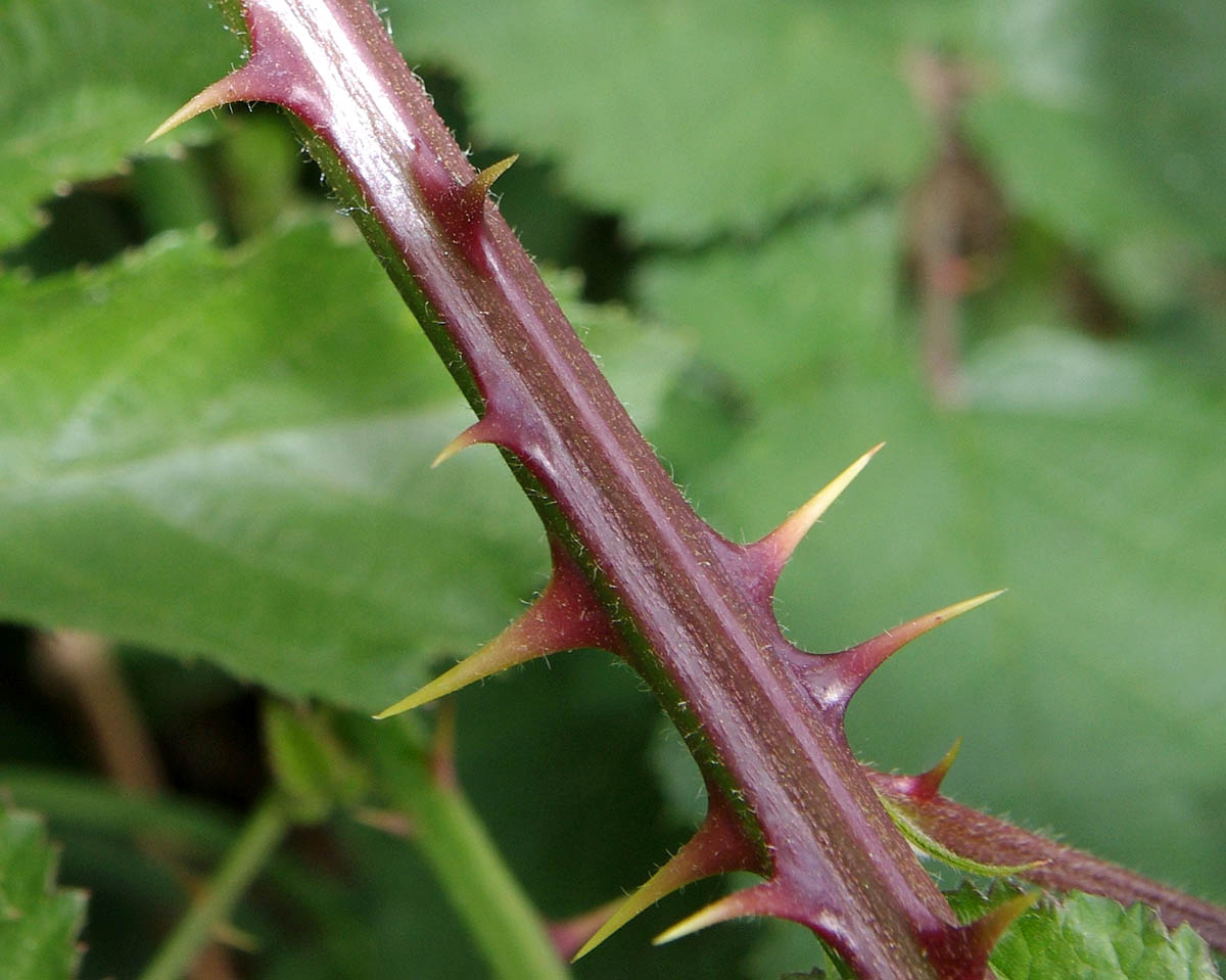 Stems are often quite prominently angled and furrowed, reddish brown becoming deep purple in strong sun. They are thinly but distinctly hairy, apparently retaining the hairs on older and exposed stems (the published description states they are glabrescent). Sessile and subsessile glands may be numerous. The prickles are frequent to numerous on the angles, sometimes in pairs, relatively long (and often much longer than the stem diameter), straw-yellow with a bright reddish base. They are usually nearly straight and patent or slightly curved; the tip is often bent or appears kinked.