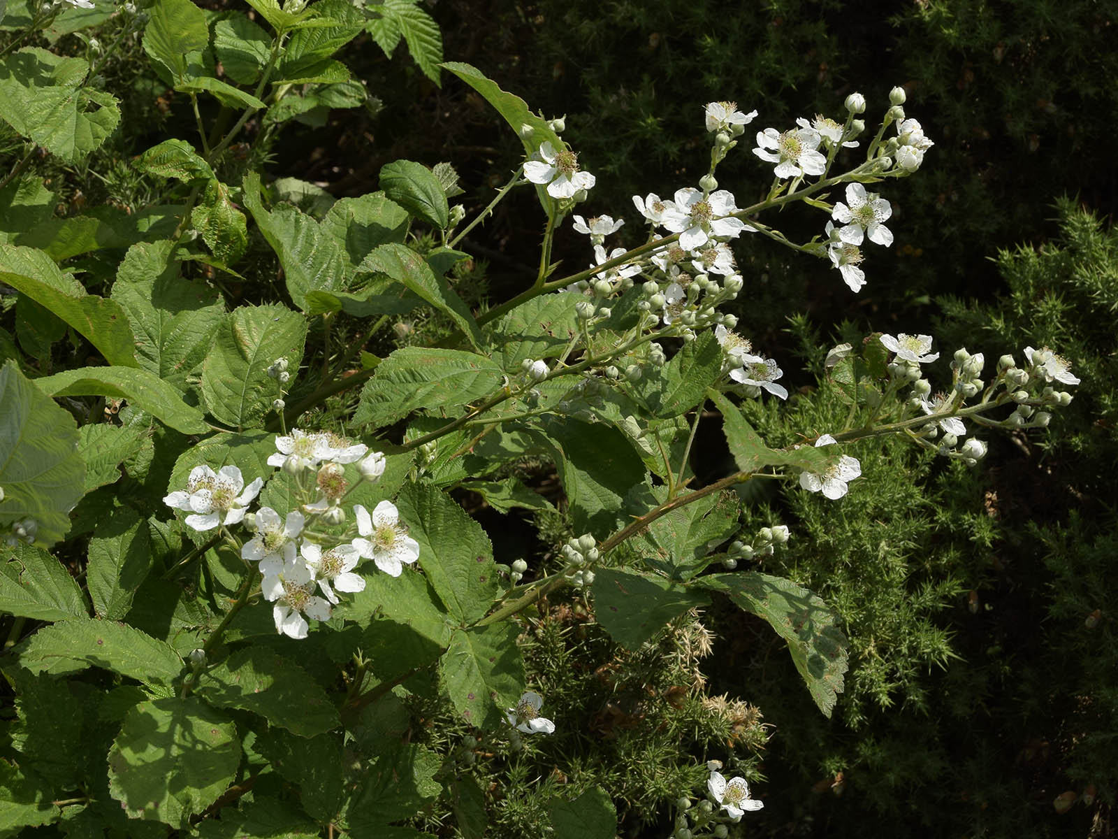 This bramble has long panicles of large white flowers, no stalked glands and slender stems with relatively few prickles. Leaves are whitish-felted below. It has a fairly small British range centred on Surrey and Greater London, with outlying records from the Isle of Wight, Wiltshire, Oxfordshire and Kent.