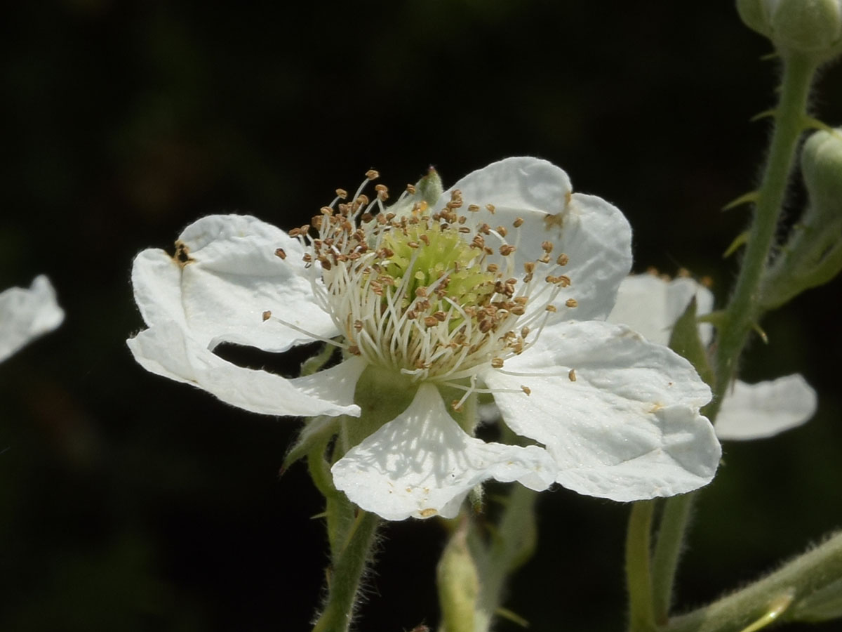 Rubus hylophilus forms clumps at least 1.5m high with eye-catching inflorescences of large white flowers which overtop the leaves and often arch outwards or downwards. These are narrowly pyramidal with relatively long and stout ascending branches, giving an open, uncongested appearance. Each panicle has several trifoliate leaves lower down subtending further ascending flowering branches (which are sometimes well developed) and there is usually one or more simple leaves at the base of the main inflorescence. The rachis and floral branches are densely pubescent above (glabrous below), green or orange-brown in colour with moderately frequent curved or hooked prickles, which are a contrasting pale golden yellow.