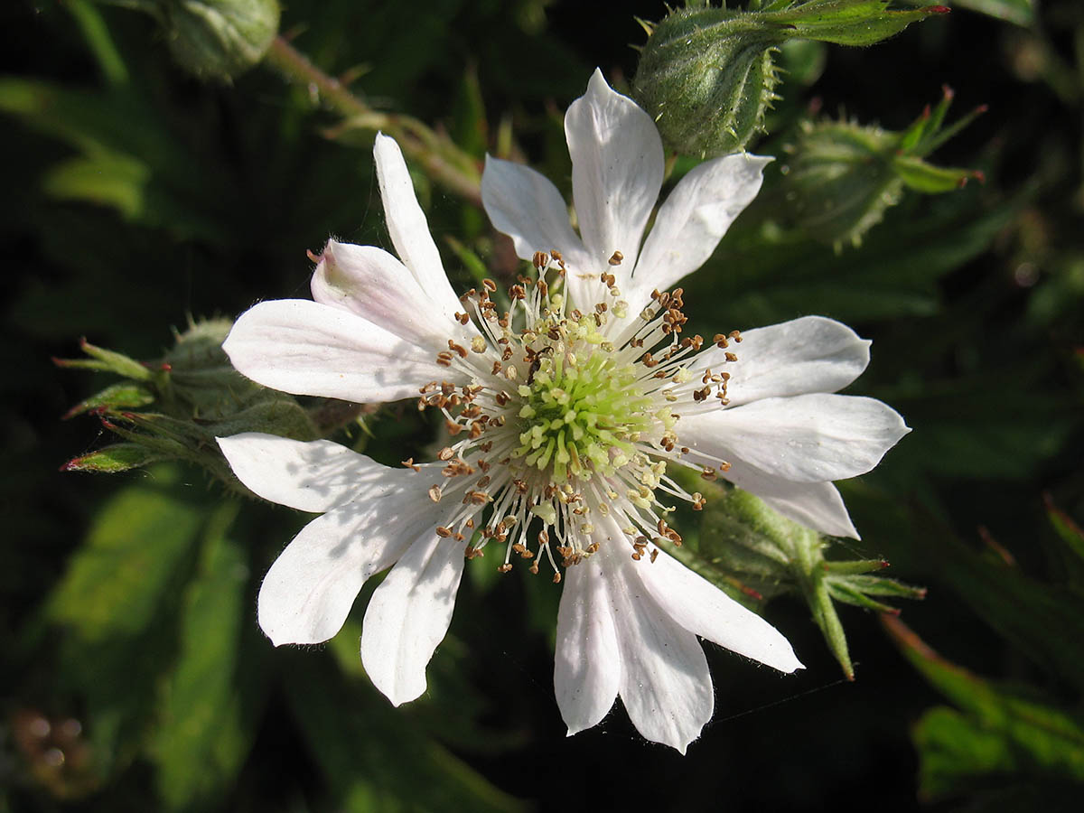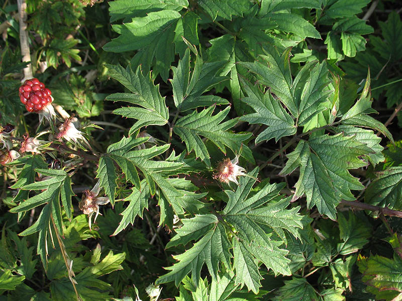 The Cut-leaved Bramble is the only species with strongly lobed and dissected leaflets, making it instantly recognisable. It is believed to be genetically related to R. nemoralis. The three-lobed pale pink petals are also unique. Although usually described as being of horticultural origin (and still sold in garden centres), this is not strictly correct as it is likely that it was originally discovered growing naturally in the wild as a genetic oddity and subsequently taken into cultivation for its attractive appearance. According to the famous batologist WCR Watson it was first mentioned in British garden literature in 1754, but it was not named until 1809. It currently occurs naturalised in the wild throughout the UK (and can be somewhat invasive), but is more scattered in the moister climate of the south-west, Wales and the highlands of Scotland. It is still increasing, especially in areas of lightly wooded heathland in southern England, but it is probably also becoming more common in rough ground and brownfield land in and around towns and cities.