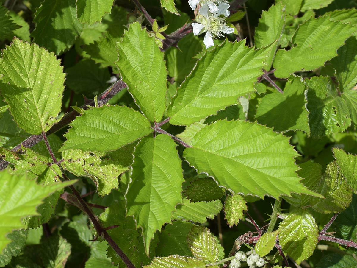 This bramble is mainly found within acid woodland, often growing in disturbed places alongside tracks and paths or within managed areas and clearings. It may also be somewhat adventive – the photo below is of a bush which was growing over a trimmed Cotoneaster hedge in an urban street in Gosport.
