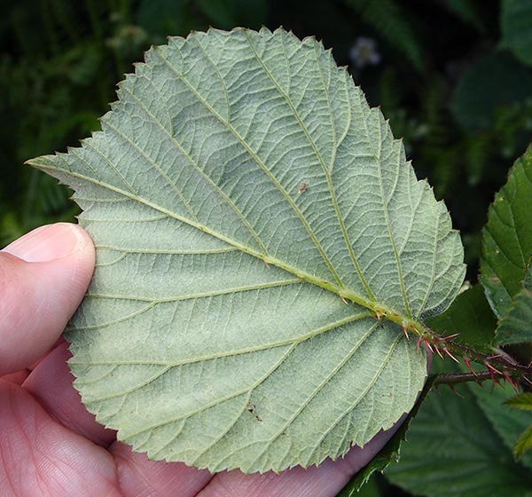A local endemic species more or less restricted to the Welsh county of Glamorgan after which it was named, but there are a handful of more scattered records. It was discovered in Gosport, Hampshire by Rubus expert David Allen (pictured below) and myself in 2012, though initially was mis-identified as R. pascuorum, a similar species in the same series. It was growing at the edge of an exceptionally rich bramble woodland in an area recently cleared of gorse. It was still surviving here in 2015 even though the gorse had grown up again. Subsequently it became more difficult to find, but a new bush appeared nearby next to a footpath in 2020. The key features of this bramble are the pale pink notched petals, strongly glandular inflorescence, broadly obovate terminal leaflet (grey-felted below) and the shining stems with variable sized prickles all round.
