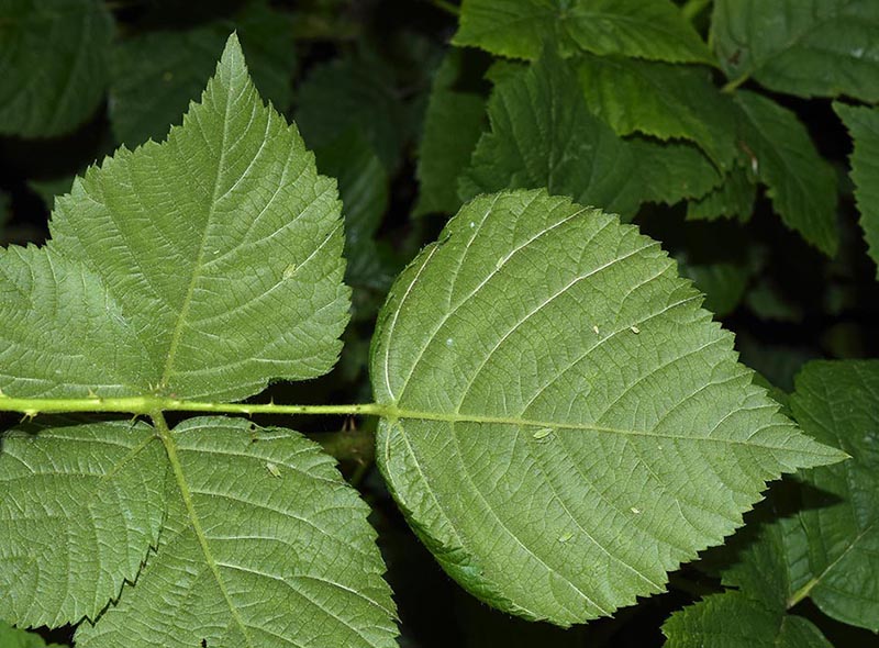 The prickles are slender, patent (perpendicular) and rather sparse on the angles of the stem. There are usually scattered long hairs. The stems can be pruinose (with a whitish waxy coating) and older ones may have reddish-brown blotches – possibly this is the only Corlylifolian with this character.