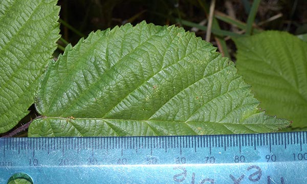 The dense prickles and pricklets on the stem are a distinctive feature, though like all brambles they vary somewhat depending on the age of the stem and its situation – compare the photos below. This species often sends out very robust and strongly armed runner stems. The purplish colour only develops in the sun. The prickles are generally patent or slightly declining. There are numerous stalked glands and sometimes sparse hairs, but often the stems are glabrous and shiny. They may also have patches of a white waxy coating. Stems in shade are less prickly.