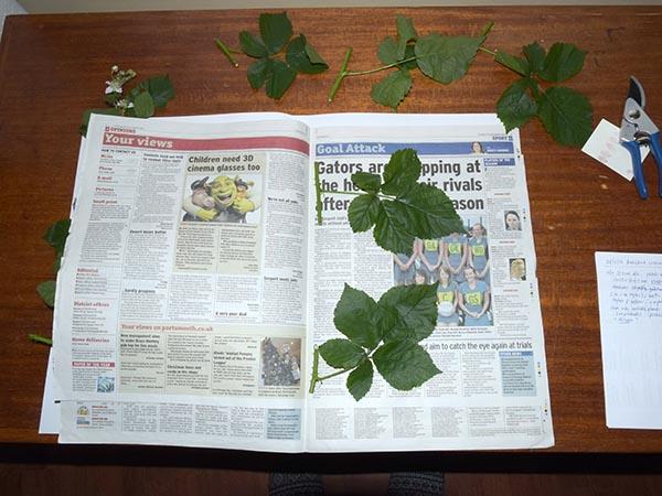 Start by arranging 2 or 3 leaves of the specimen on one of the opened out (double) sheets of newspaper. Keep the stems to the left hand side and fold over the newspaper.